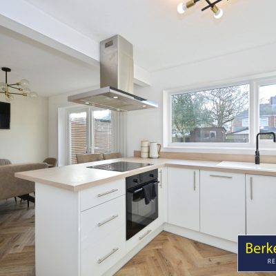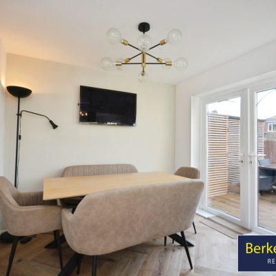The property offers a separate reception room with large windows, providing generous natural light and a comfortable living space. To the rear, an open-plan kitchen with dining space benefits from excellent natural light and direct access to the garden, creating a practical area for day-to-day living and entertaining. The garden offers useful outdoor space.