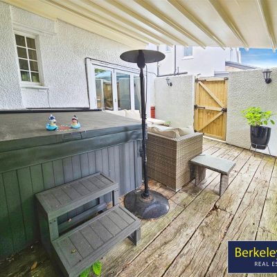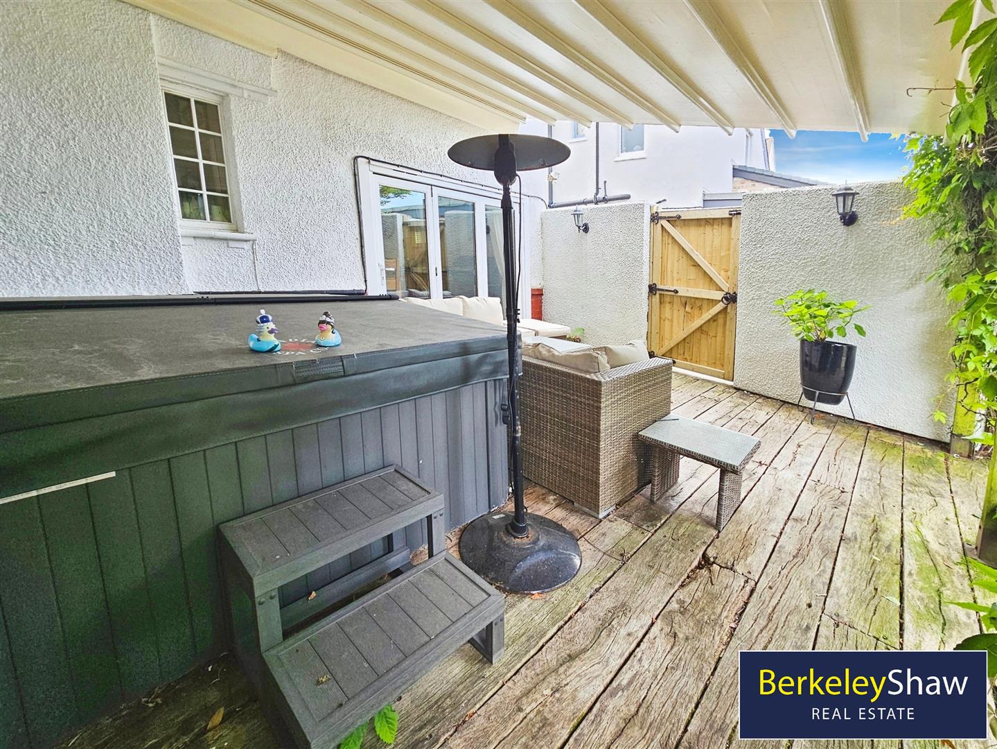 The home's heart is the kitchen with breakfast dining area, which leads to a utility room and WC. It is a perfect setting for family meals, offering all the amenities needed for modern living. Leading over the kitchen threshold into the enchanting garden, you are immediately greeted by the canopy covered hot tub along with the outdoor dining area with a serene backdrop.