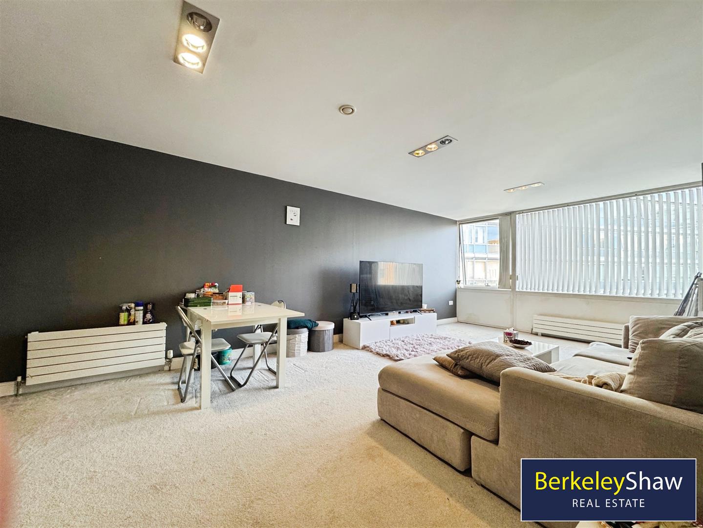 A fantastic open-plan living, dining, and kitchen area, creating a bright and versatile space ideal for both relaxing and entertaining. The living area benefits from double glazed windows offering views towards The Royal Albert Dock.