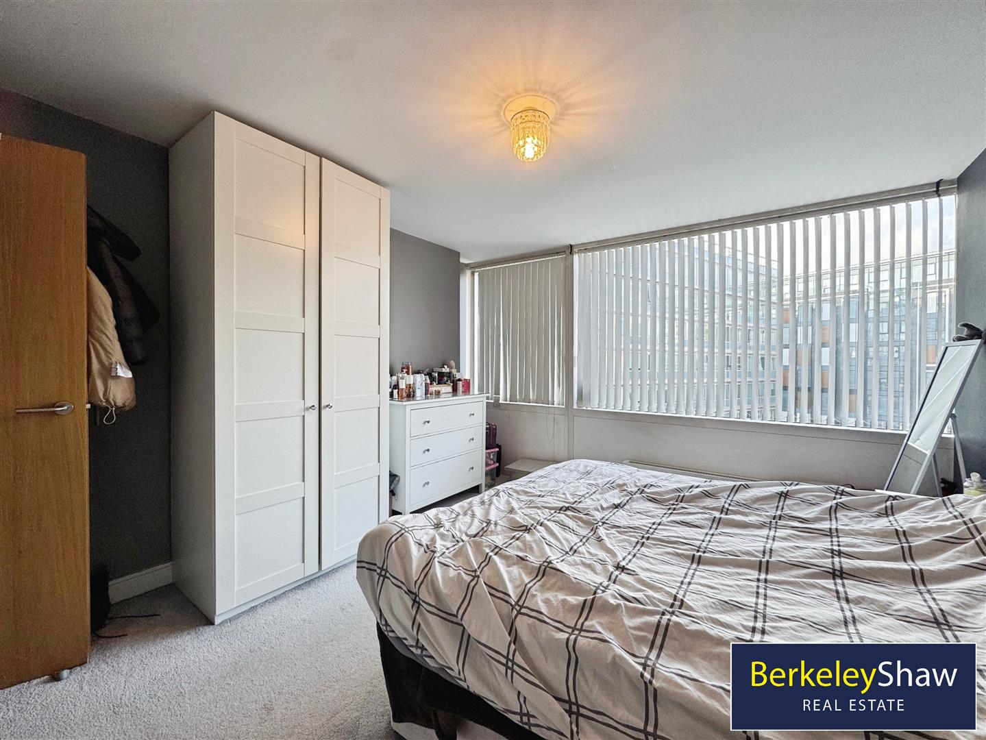 The room benefits from double glazed windows with fitted blinds. The space is fully carpeted and heated by a radiator, with a useful storage cupboard that has been thoughtfully utilised as a wardrobe.