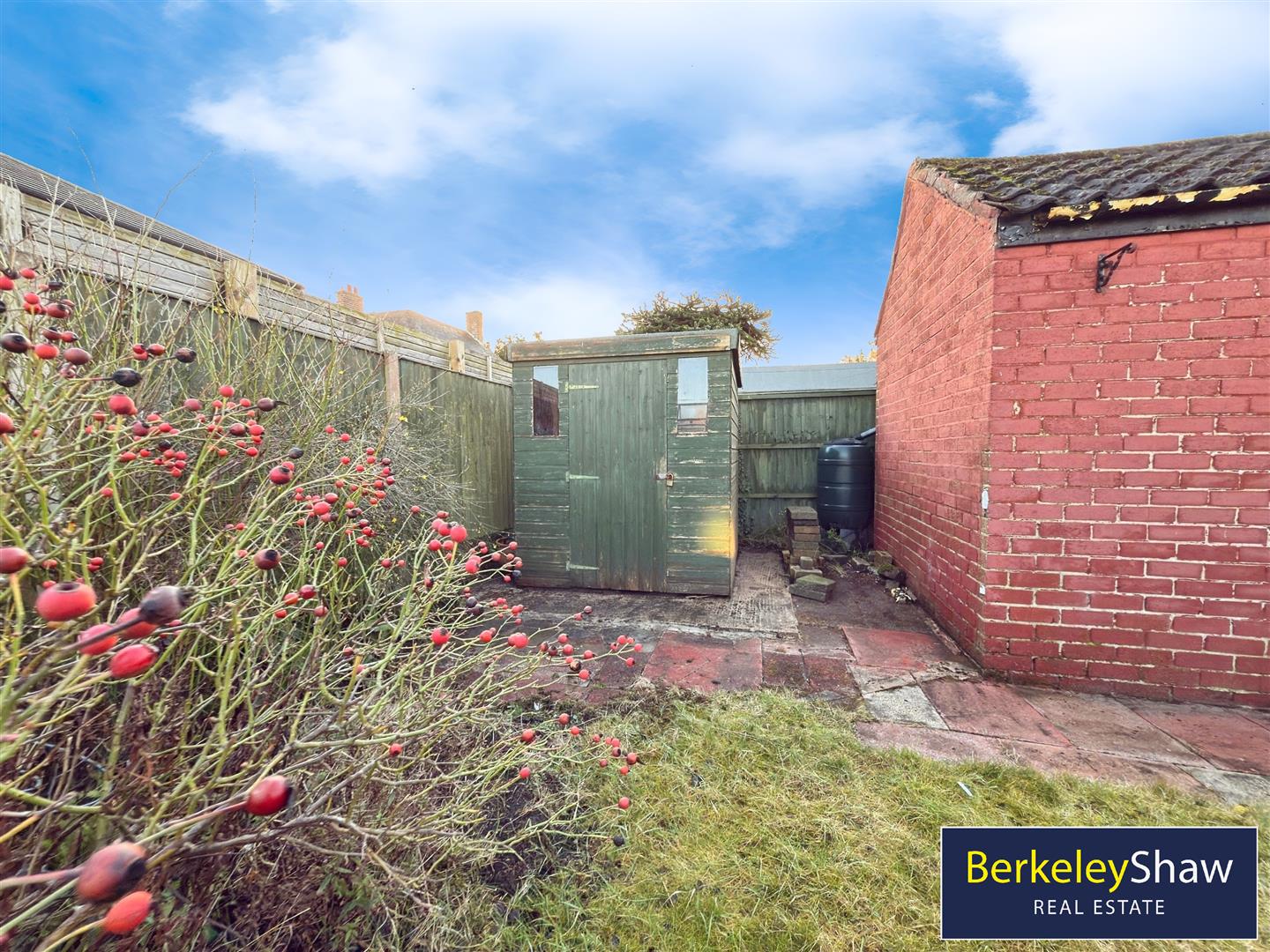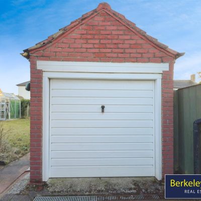 The property enjoys a bright SOUTH-facing rear GARDEN, ideal for making the most of sunny days, along with excellent off-road parking. There is a driveway providing space for two to three vehicles, leading through gated access to a covered car port area, and further complemented by a detached garage with a pitched roof, offering additional parking, storage, or workshop potential.