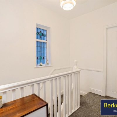 A bright and attractive landing area featuring a stunning stained-glass lead-lined window, loft access, and doors leading to all first-floor accommodation.
